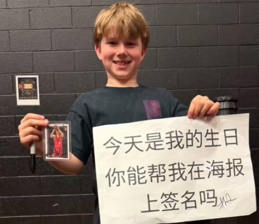 吉祥坊app – 生日愿望成真!一位年轻球迷举着中文海报请求杨汉森签名,成功实现了他的梦想,并获得了波特兰开拓者队官方账号的赞扬